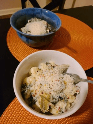 We signed up for Blue Apron to get two meals per week sent to us. This was our first one: gnocchi with spinach and artichoke in a cream sauce with prosciutto and parmesan. It was easy to make, basically, just dump all the ingredients into the provided pan, cover it with foil, and bake. Clean-up was a breeze. It was one of the ‘ready to cook’ recipes. Tonight will be a salmon recipe but it will require a few more steps